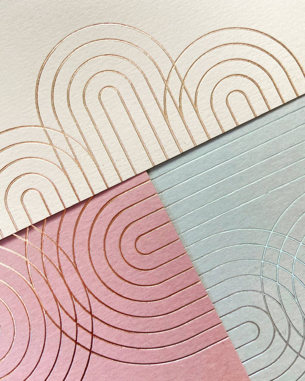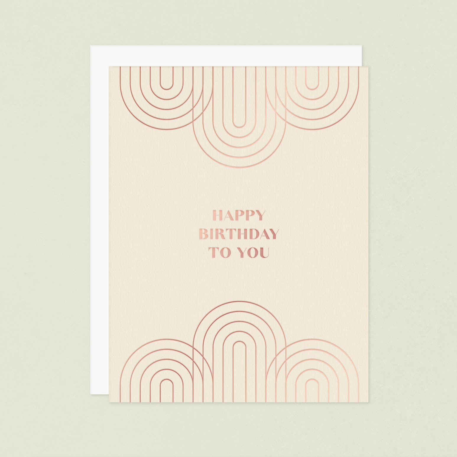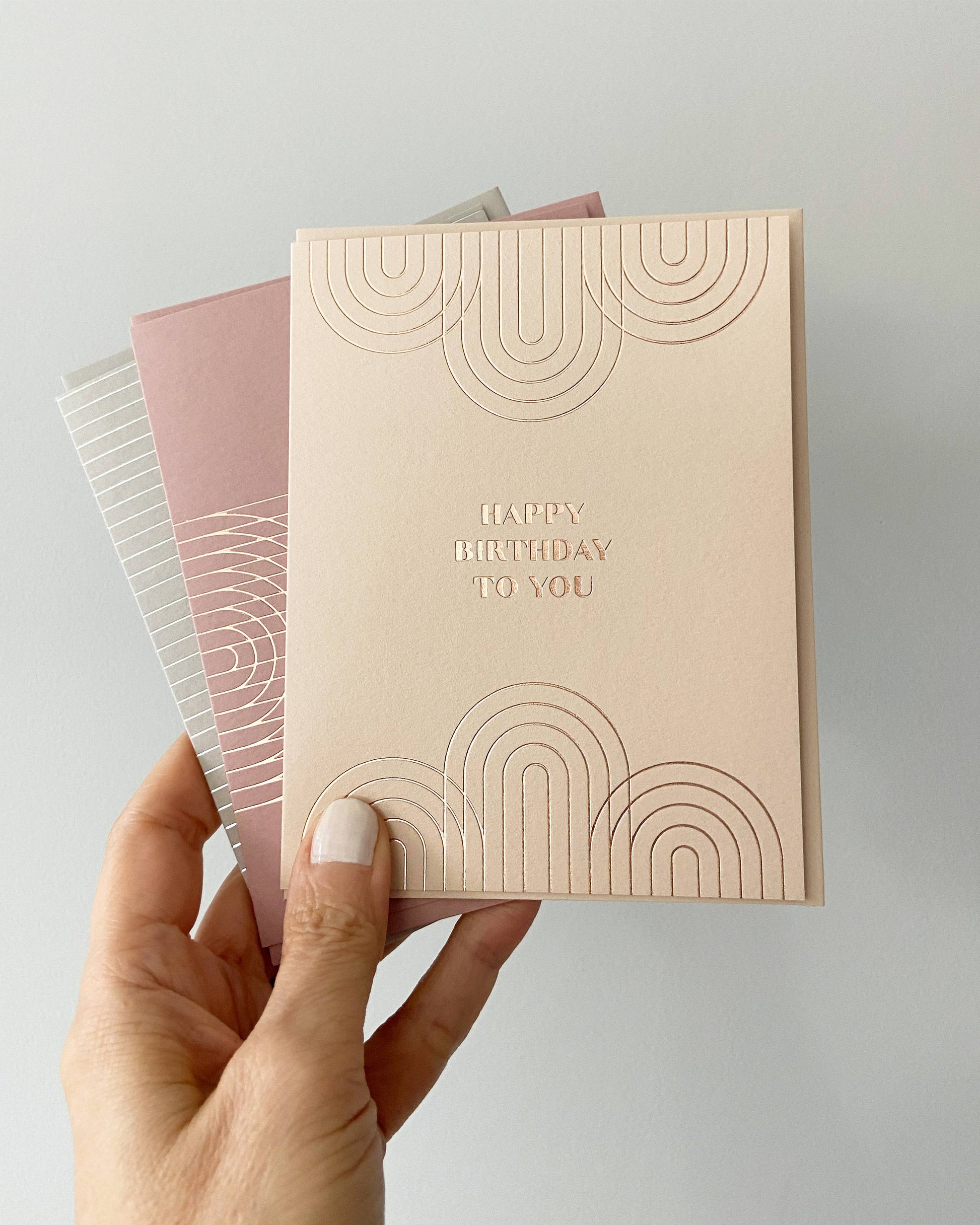 Our Arches Birthday card is art deco inspired in delicate rose gold foil on richly colored paper.