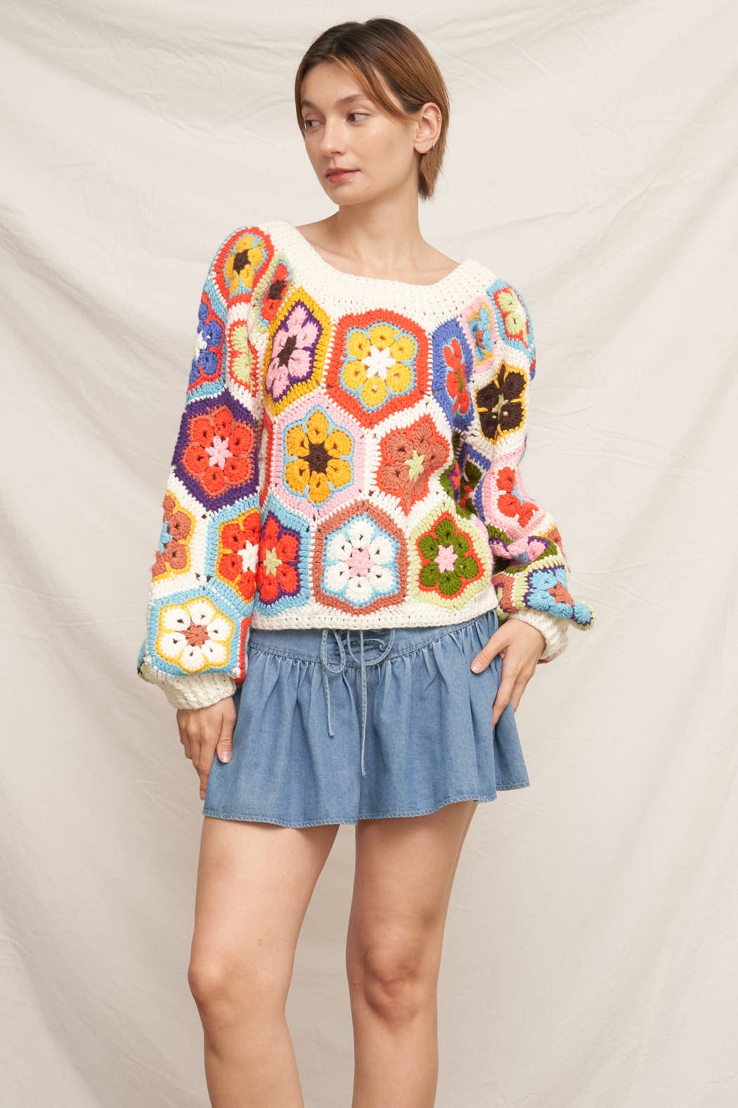 This chunky oversized crochet sweater features a classic granny square design with a relaxed, slouchy fit that’s made for layering. Bold in texture and timeless in style, it brings a handcrafted feel to everyday dressing — easy to throw on, easy to love.