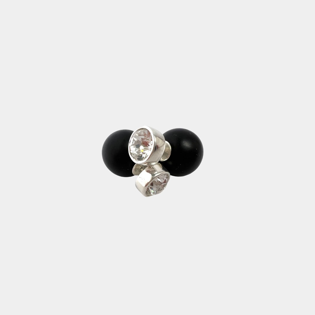 Double sided stud: the front features a 5mm round Swarovski crystal, bezel set in sterling silver. The back is an 8mm round, matte resin ball. They "hug" the lobe with a sterling silver post. Super light-weight, great size for every day wear.