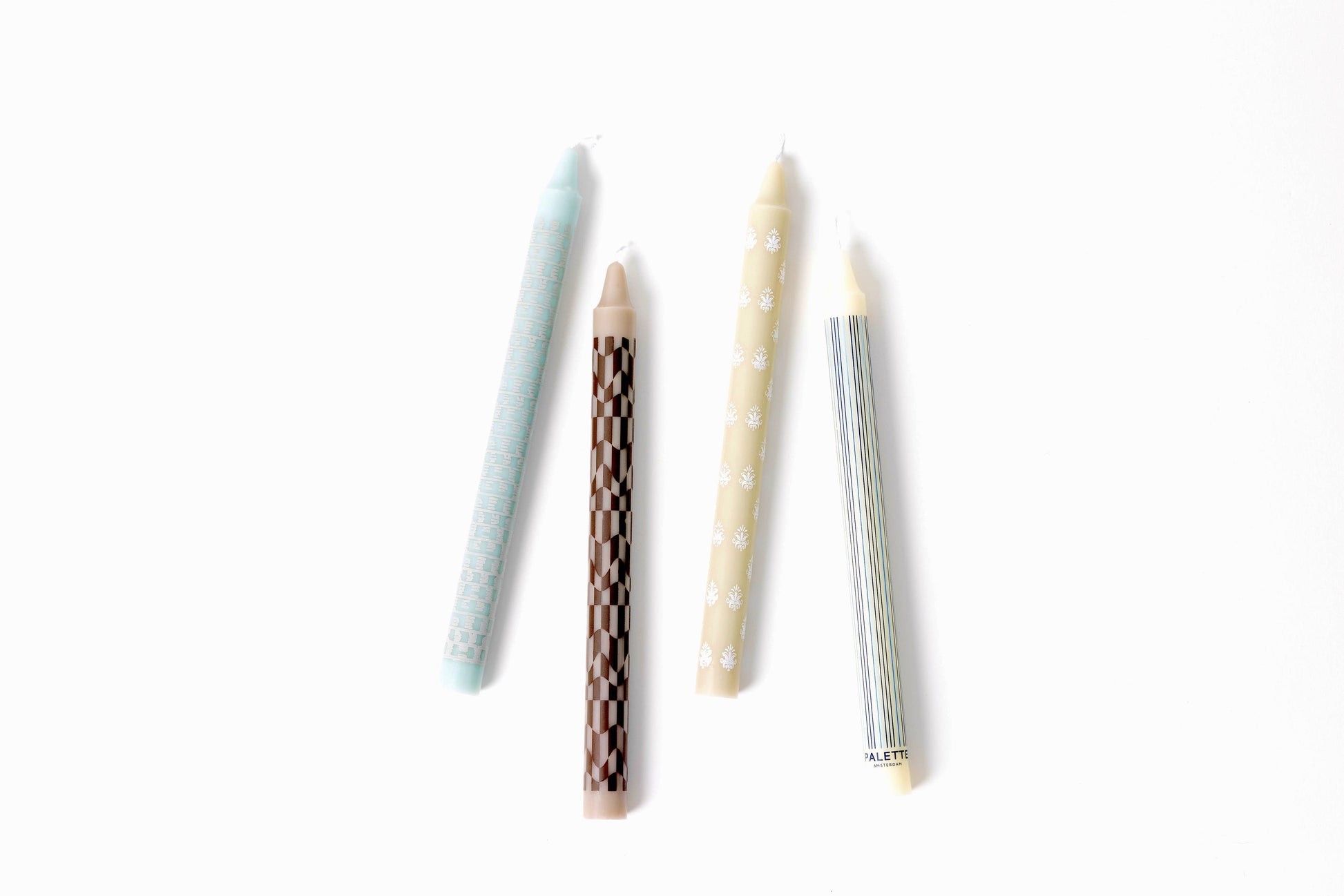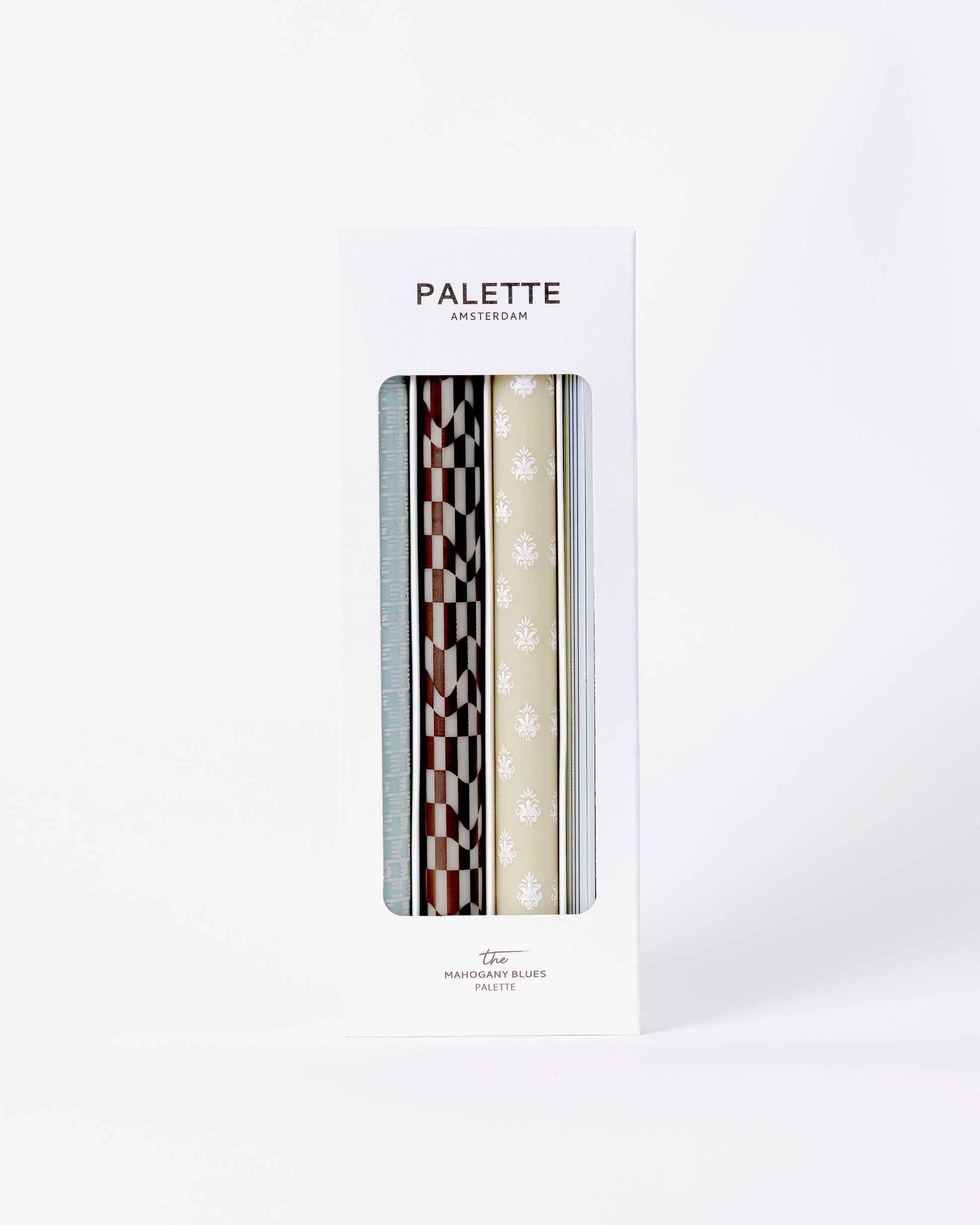 The Mahogany Blues Palette is a set of four tall dinner candles with exclusively designed prints in a palette of light blue, brown, white & blue candles. Created to bring harmony & character to a timeless, natural interior!