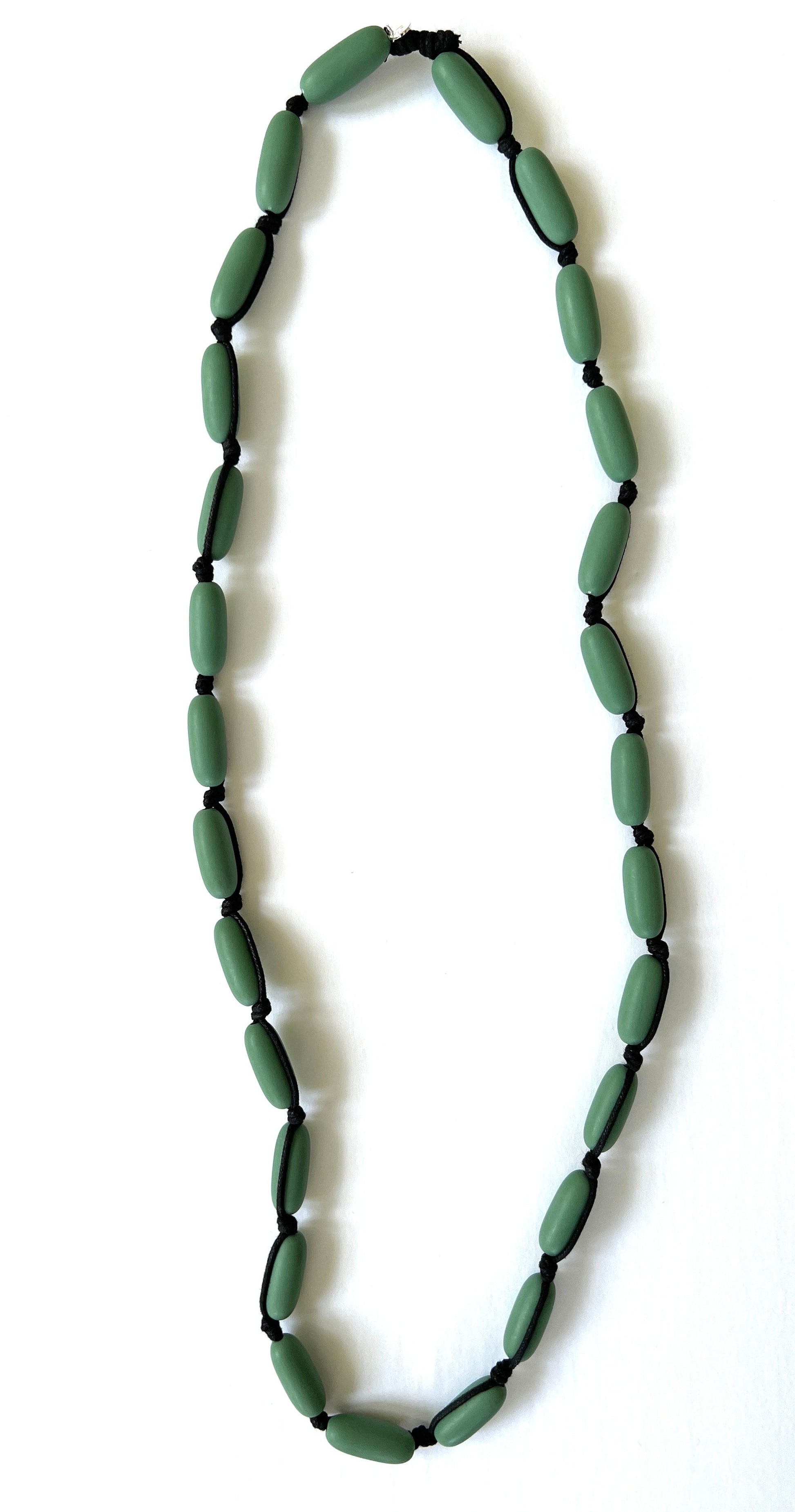 Each necklace is made of 27, 1 ¼-inch long resin beads that are hand-knotted on cotton cord, with a round, silver EM logo tag. The beads have a matte finish and are smooth to the touch. The necklace slips over the head, so there’s no clasp. It weighs 3.8 ounces and measures approximately 42 inches long (it hangs approximately to the navel). It can be worn doubled. Best layered in multiples—mix, match, mismatch. See Style Inspo for ideas.