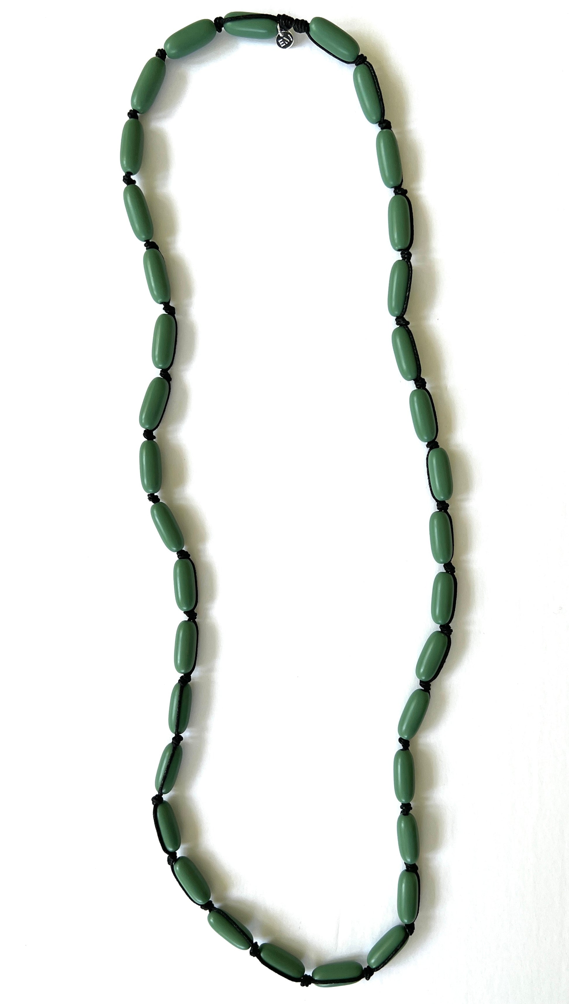 Each necklace is made of 35, 1-inch long resin beads that are hand-knotted on cotton cord, with a round, silver EM logo tag. The beads have a matte finish and are smooth to the touch. The necklace slips over the head, so there’s no clasp. It weighs 2.5 ounces and measures approximately 42 inches long (it hangs approximately to the navel). It can be worn doubled. Best layered in multiples—mix, match, mismatch. See Style Inspo for ideas.