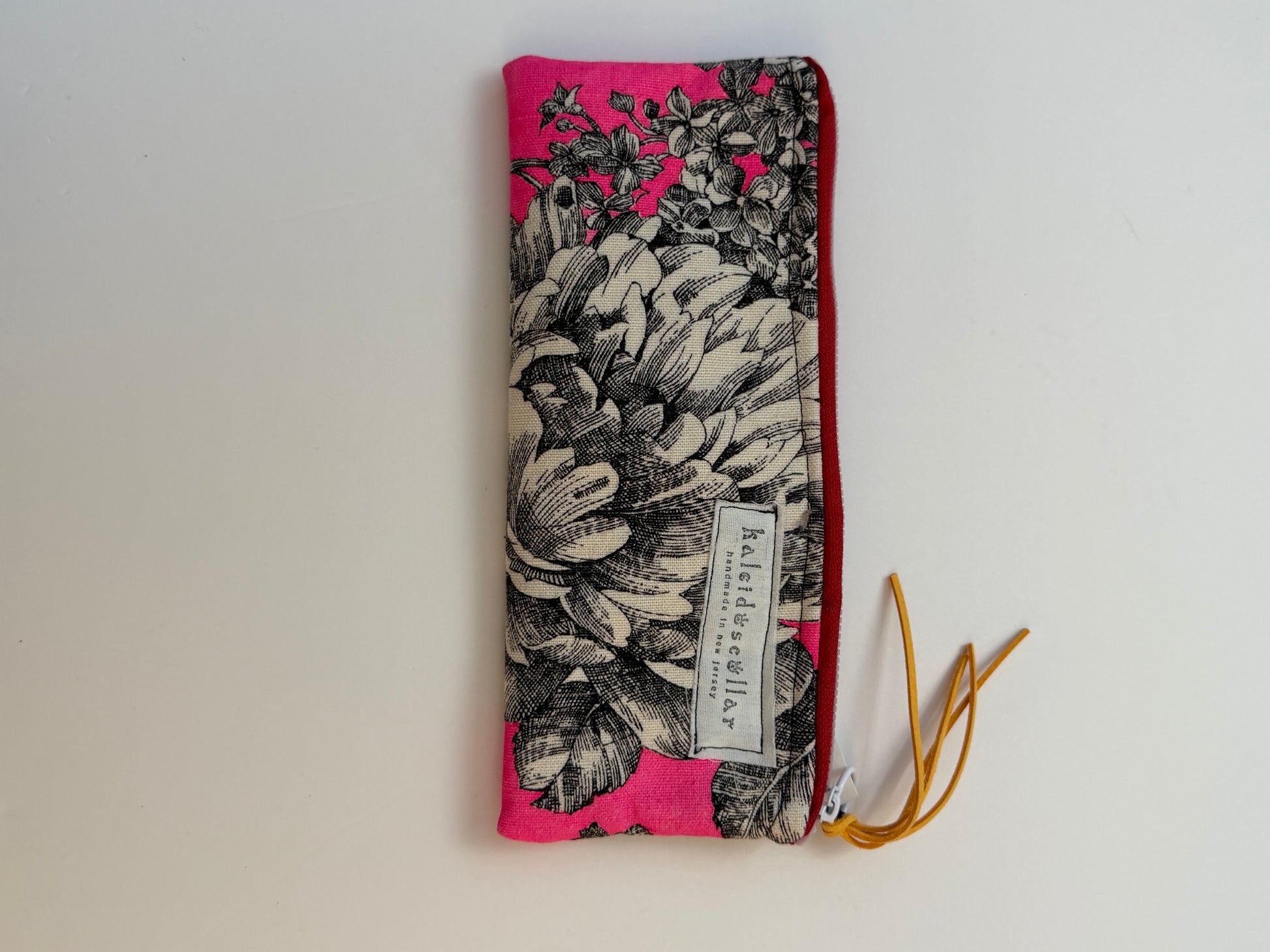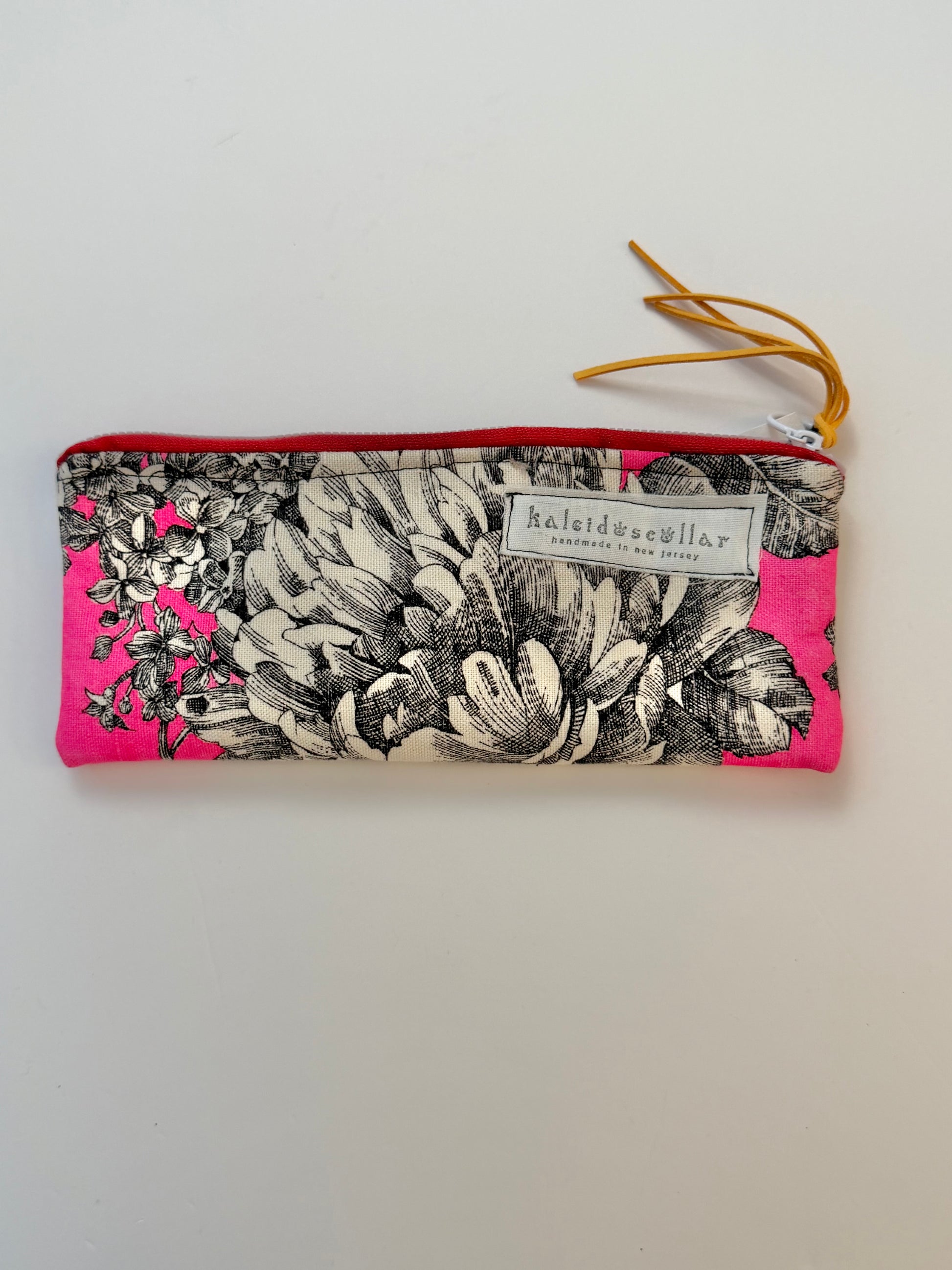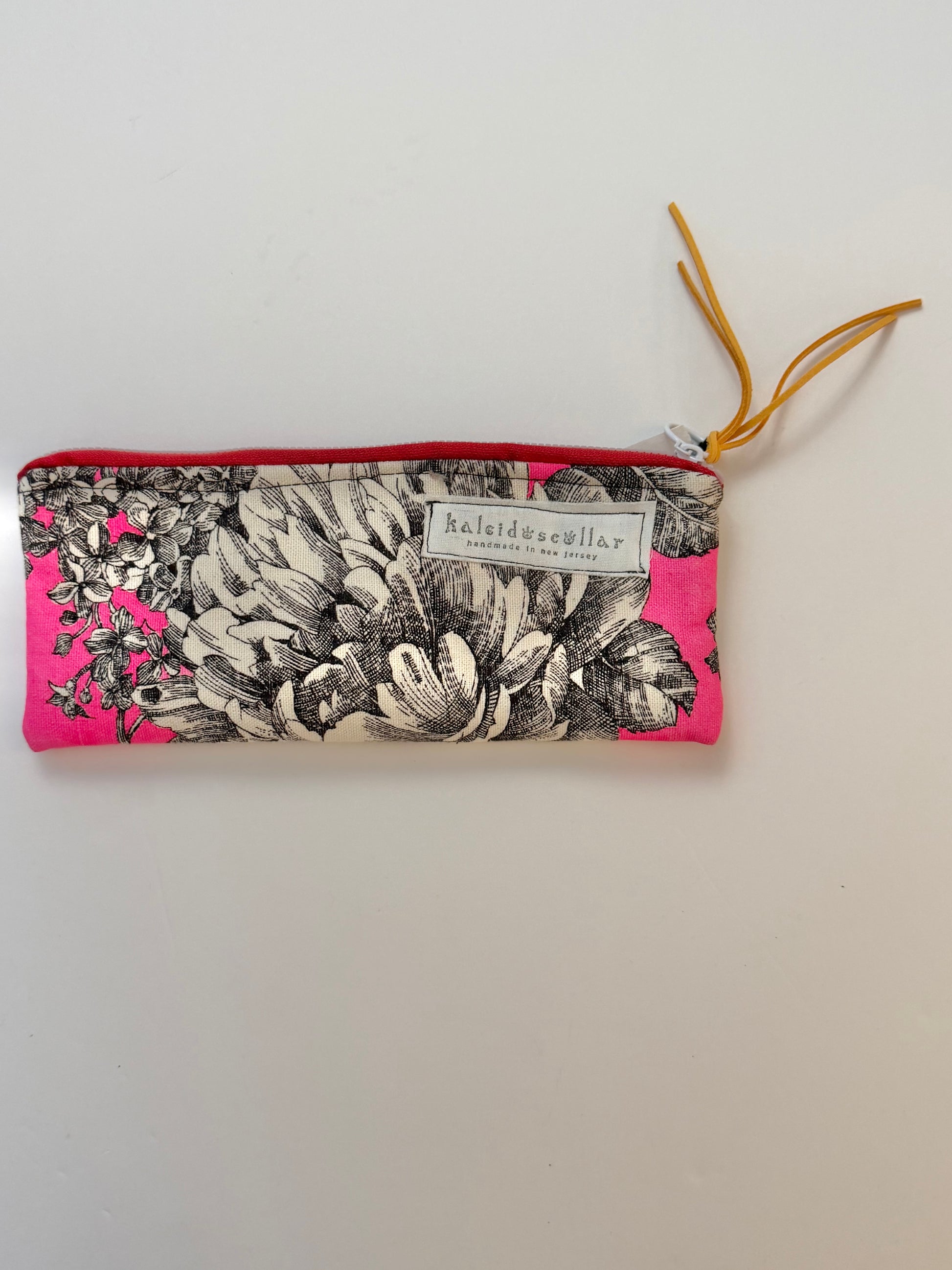 Pencil case- vintage hand painted fabric- neon pink + peonies