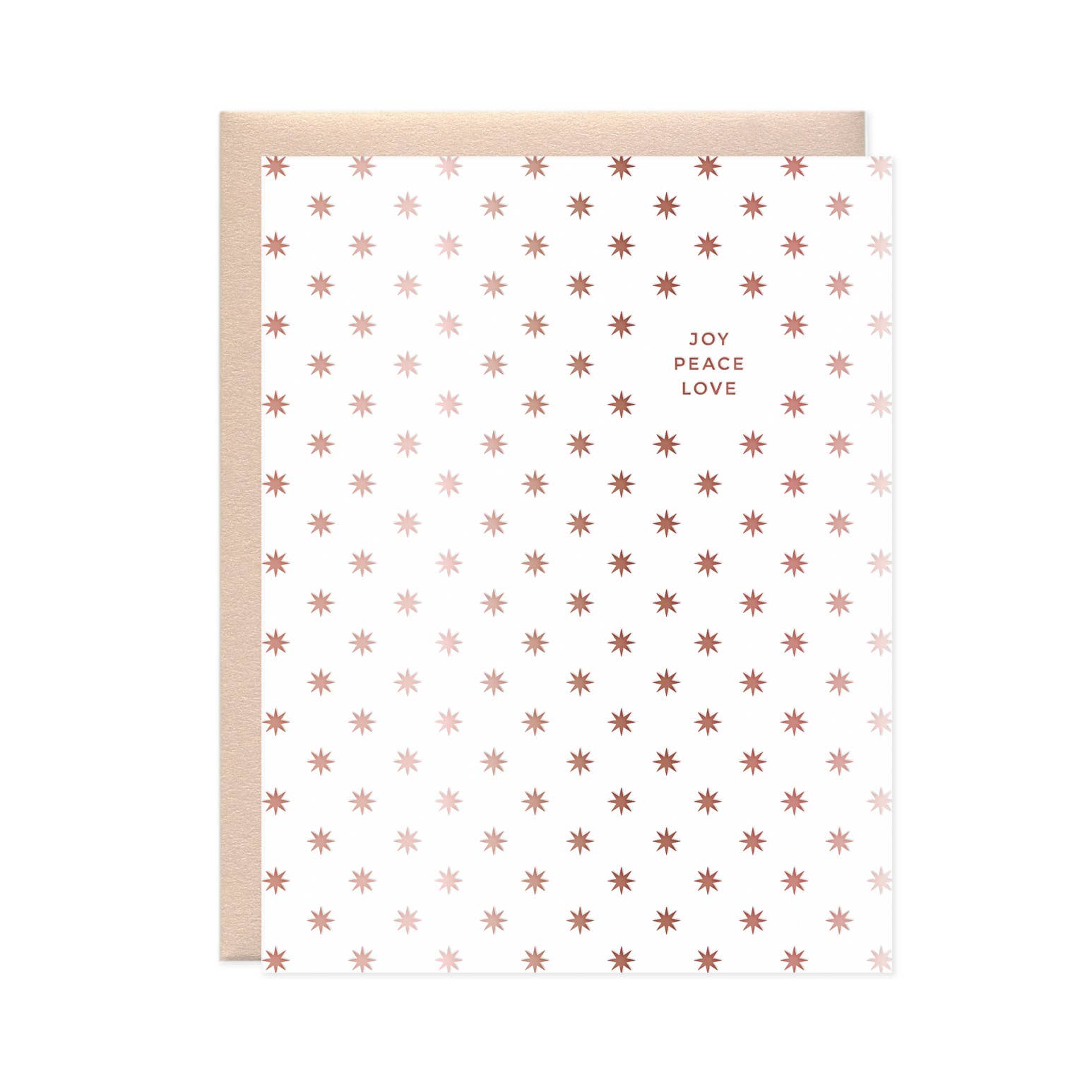 Our starry Joy Peace Love greeting card is deco-inspired in delicate rose gold foil.