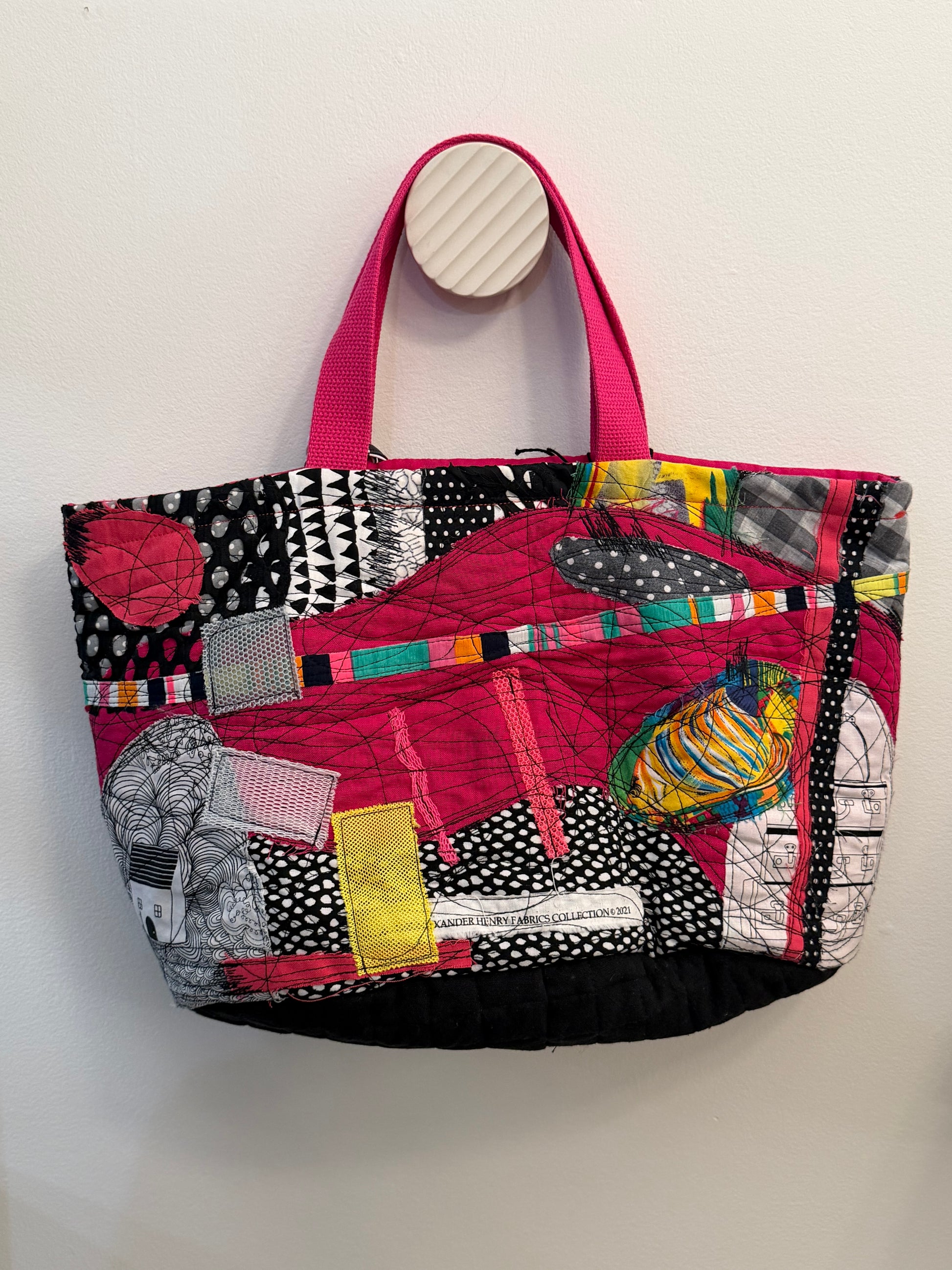 Large art bag with pink straps, Sun + Fish, fabric collage