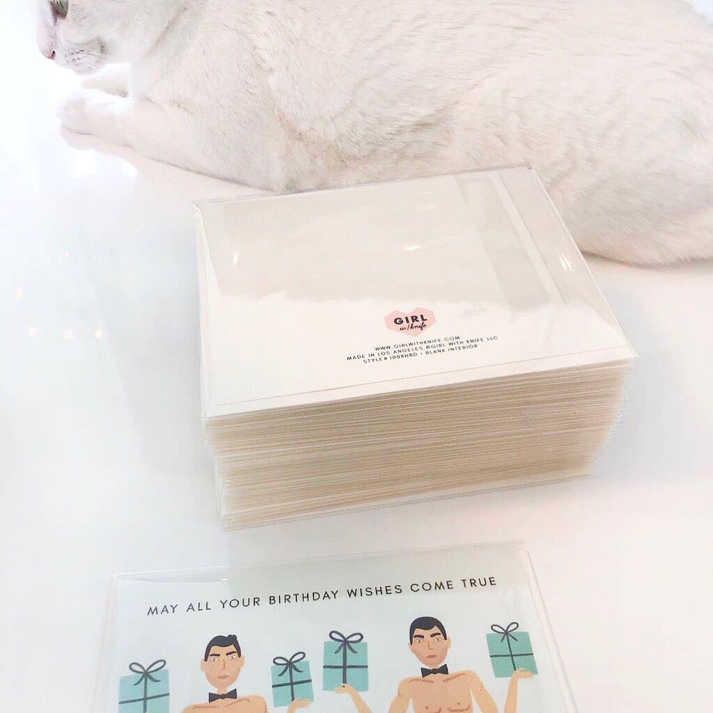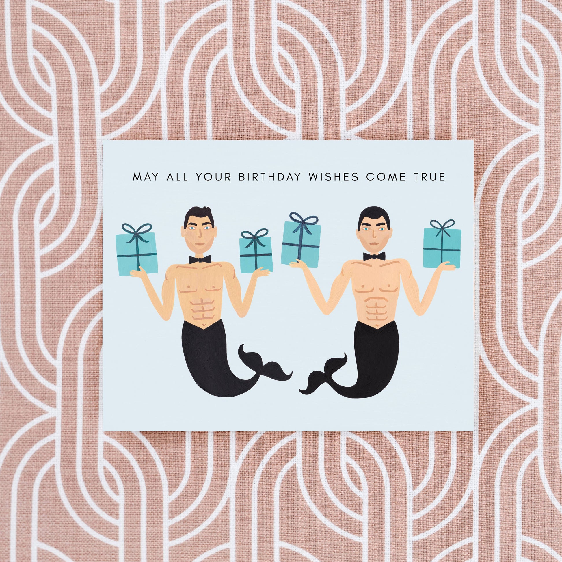 May All Your Birthday Wishes Come True greeting card. Buff bowtied mermen, turquoise boxes and I think you're off to a good start. Single blank interior greeting card with matching ivory envelope.