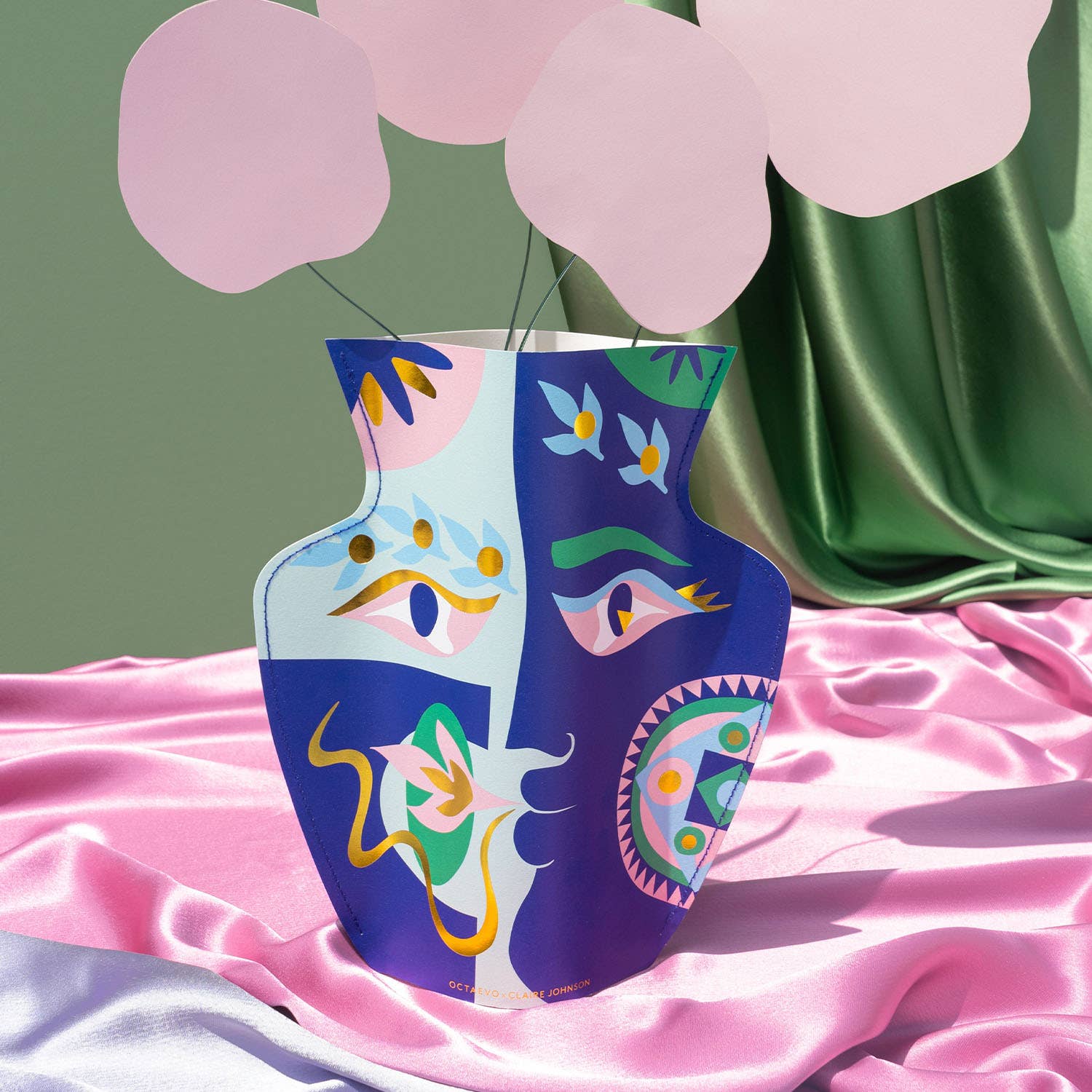 This is a handcrafted flower vase with a twist. Rather than ceramics or glass, its made from special waterproof paper. Its a beautiful centerpiece on a dinner table and an eye-catching decorative touch to any desk or shelf. Octaevo paper vases durable, easy to use and easy to store. To use it, just open the vase, slip in a glass or water bottle, pour in some water, and add your favorite flowers. Working with the theme of two gods, two lovers, Claire Johnson's artistic interpretation resulted in two paper collages featuring twirling mandalas, laurel wreaths and sparkling eyes, which we adapted into prints. Material: 180 gr waterproof paper Size: 11.5 x 11.5"" (290 x 290mm) Print: Offset with metallic foil stamping Embellishment: Laminated and sewn by hand Packaging: Paper sleeve with gold stamping"