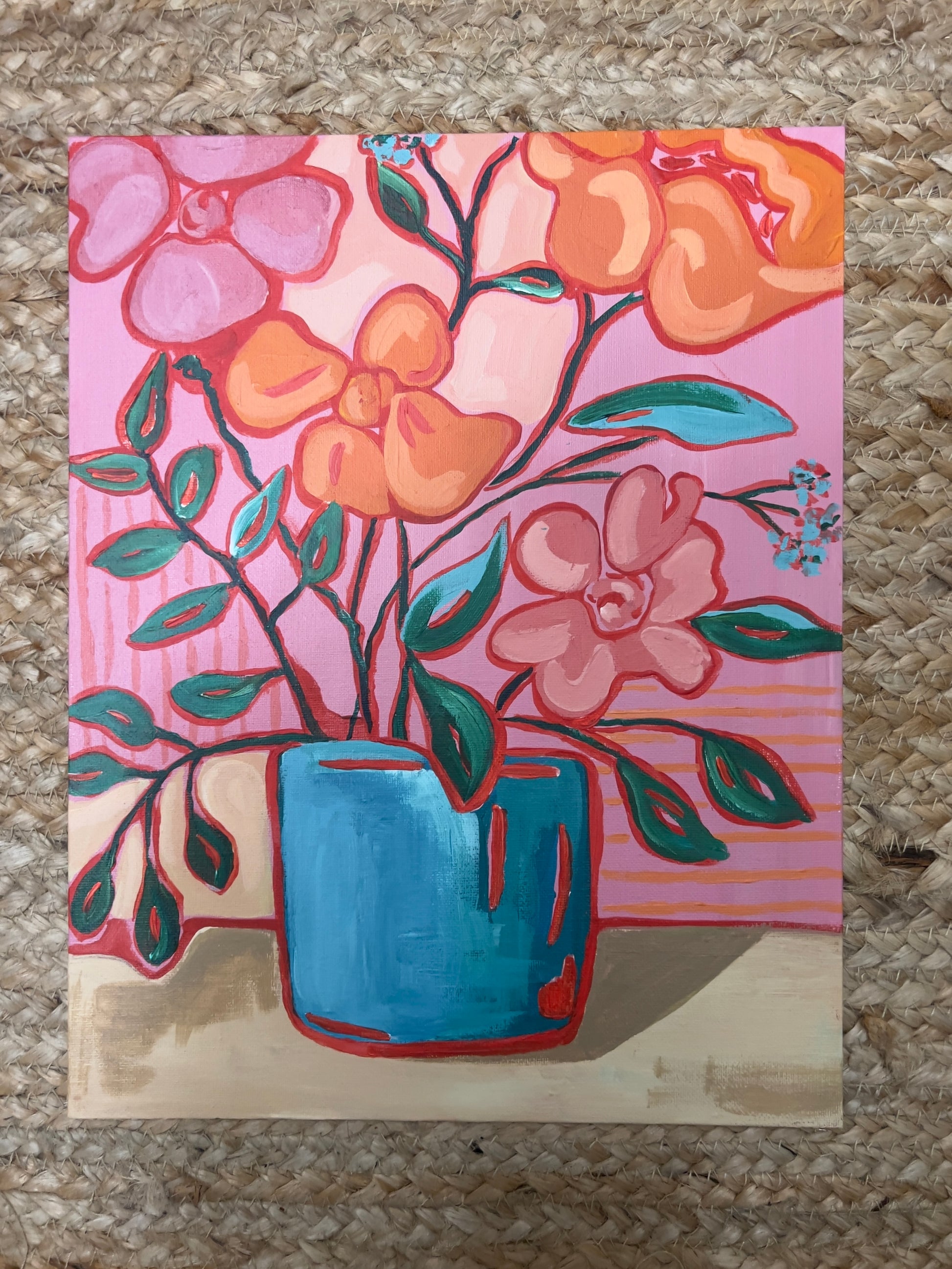 Celebrate color and creativity with this vibrant original acrylic painting. Featuring oversized blossoms in coral, peach, and rose pink with teal-green leaves, the composition bursts with life against a playful striped pink backdrop. A striking blue vase anchors the arrangement, adding bold contrast and contemporary edge.