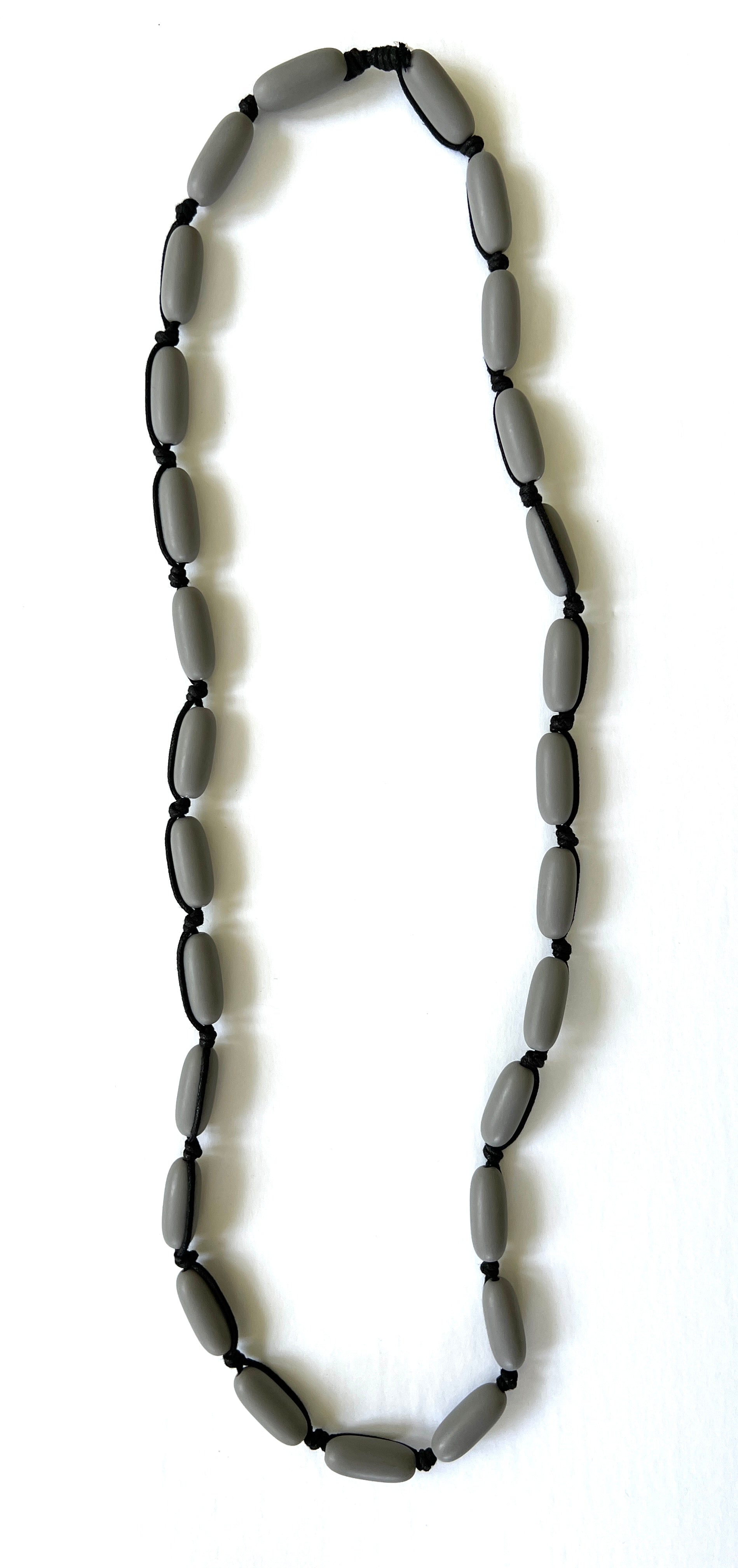Each necklace is made of 27, 1 ¼-inch long resin beads that are hand-knotted on cotton cord, with a round, silver EM logo tag. The beads have a matte finish and are smooth to the touch. The necklace slips over the head, so there’s no clasp. It weighs 3.8 ounces and measures approximately 42 inches long (it hangs approximately to the navel). It can be worn doubled. Best layered in multiples—mix, match, mismatch. See Style Inspo for ideas.