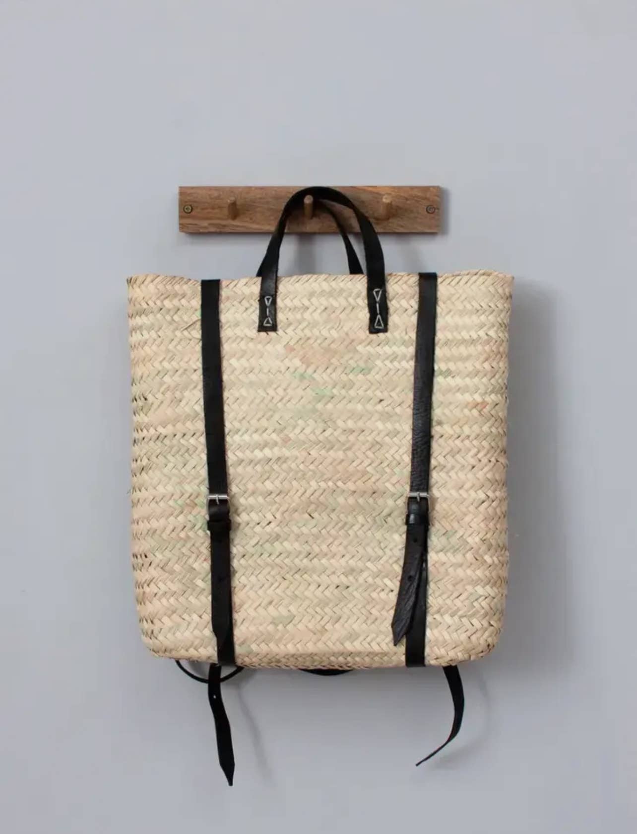 Handcrafted Moroccan Basket Backpack made from durable Dwarf Palm from the Sahara region. Features adjustable leather shoulder straps and top handle for versatile carrying options. Interior includes secure pull cord and lining. Practical for farmers markets and beach outings. Easily cleaned with warm soapy water. Available with black, brown, or natural leather straps.