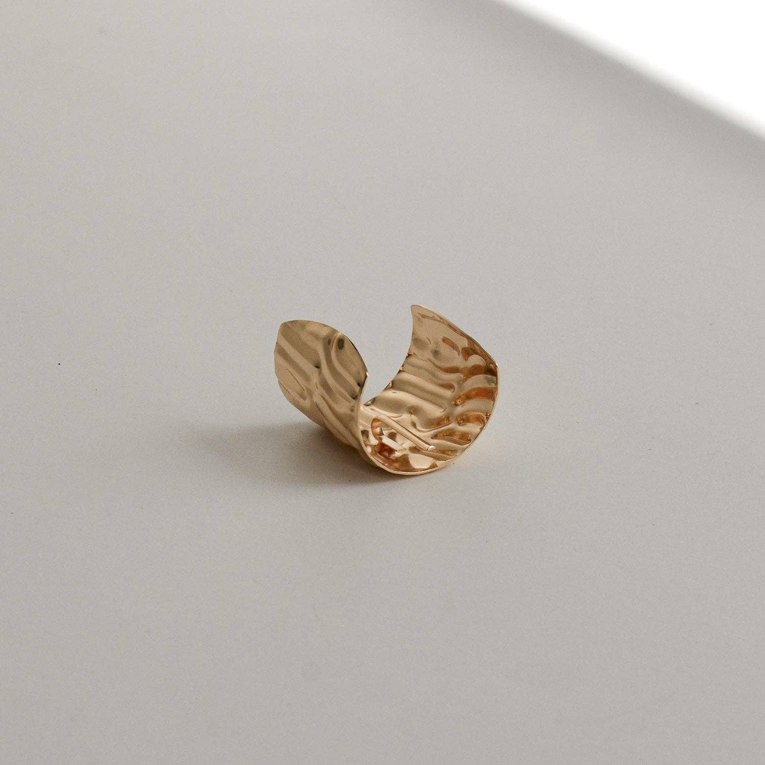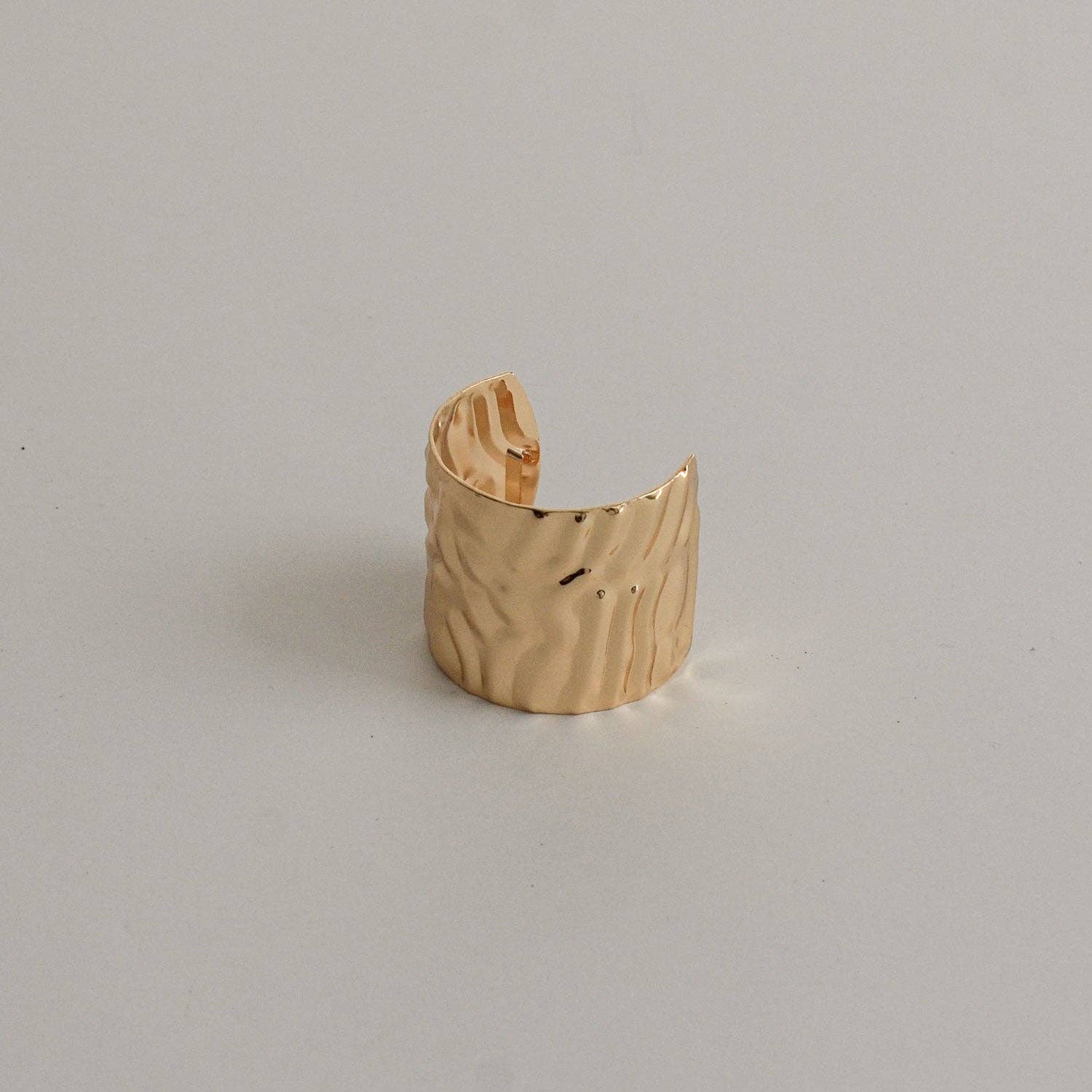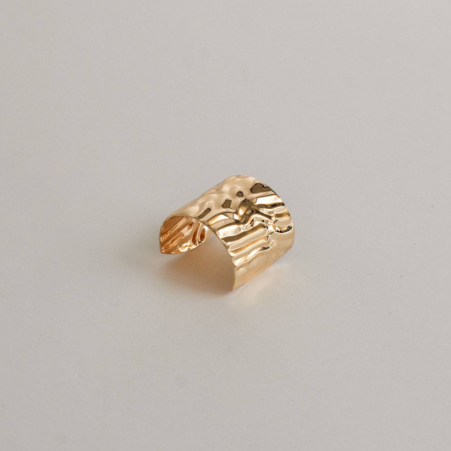 * The Textured Metal Hair Ponytail Cuff Stick | Gold is a stylish hair accessory that adds elegance to any hairstyle. Its built-in stick and shaped cuff secure the band firmly in place, and its lightweight and compact size makes it great for on-the-go styling. Suitable for all hair types and perfect for various occasions. Dimensions: 1.6" x 1.5", Material: Alloy.