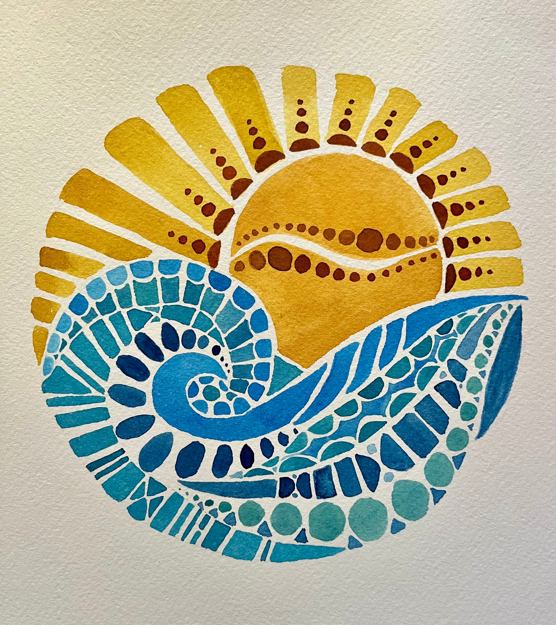 A wash of golden light meets the rhythm of the sea. Kelly Duane’s watercolor layers warm ochres with cool blue waves, creating a sense of harmony and movement that feels alive. The perfect accent for any coastal-inspired space.