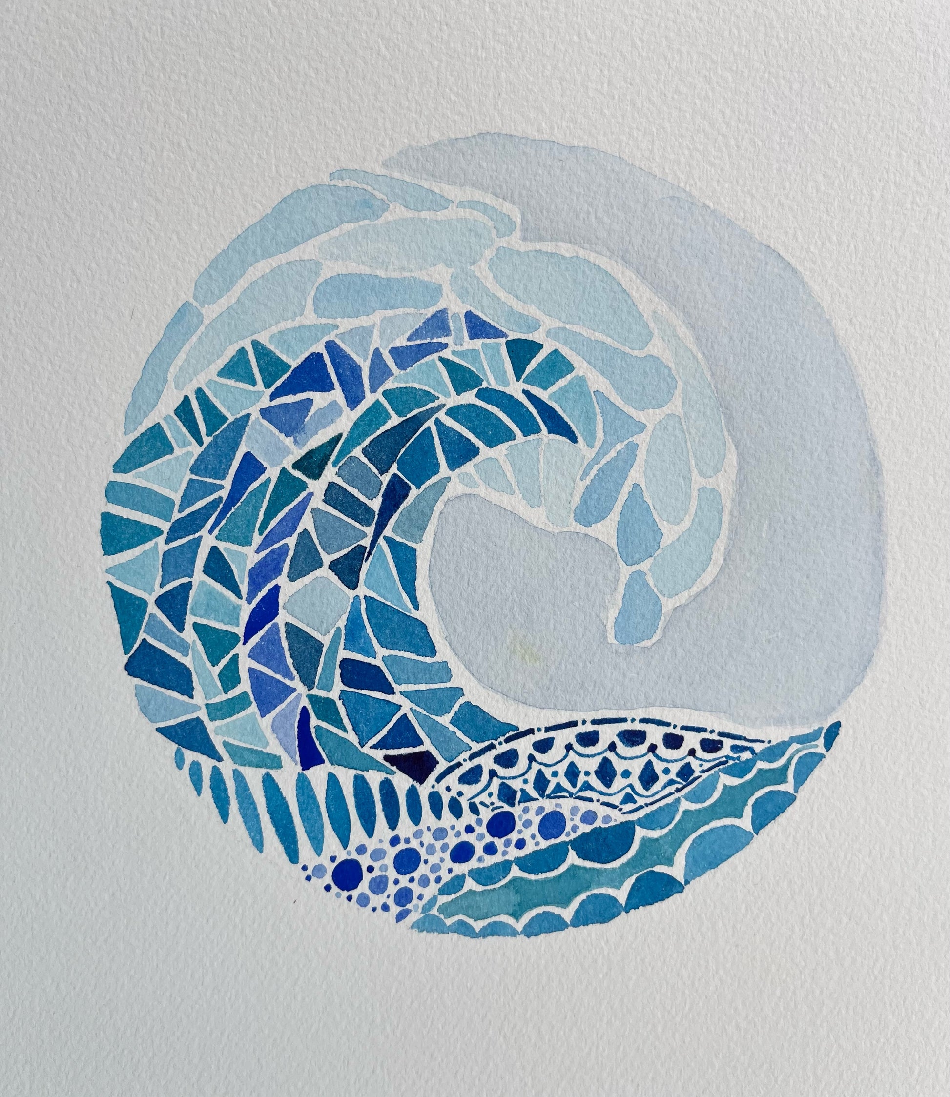 Soft ocean blues flow into deep indigo in this abstract watercolor by Kelly Duane. The organic shapes and delicate ink details capture the quiet strength of the tide—calming, fluid, and endlessly captivating.