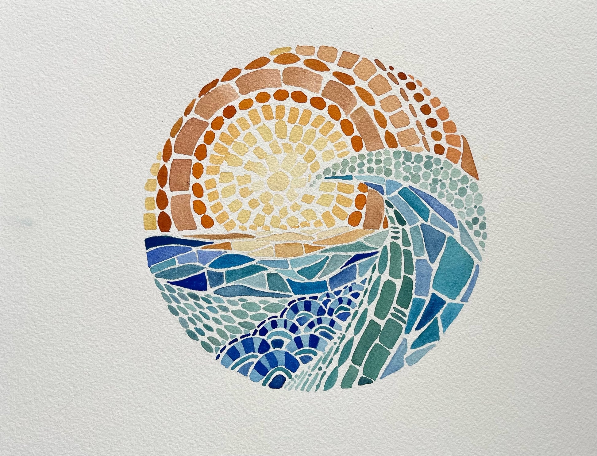 Sunlight meets saltwater in this balanced composition of gold, sand, and sea tones. Kelly Duane’s geometric watercolor style evokes the first light over the horizon—peaceful, modern, and full of warmth.