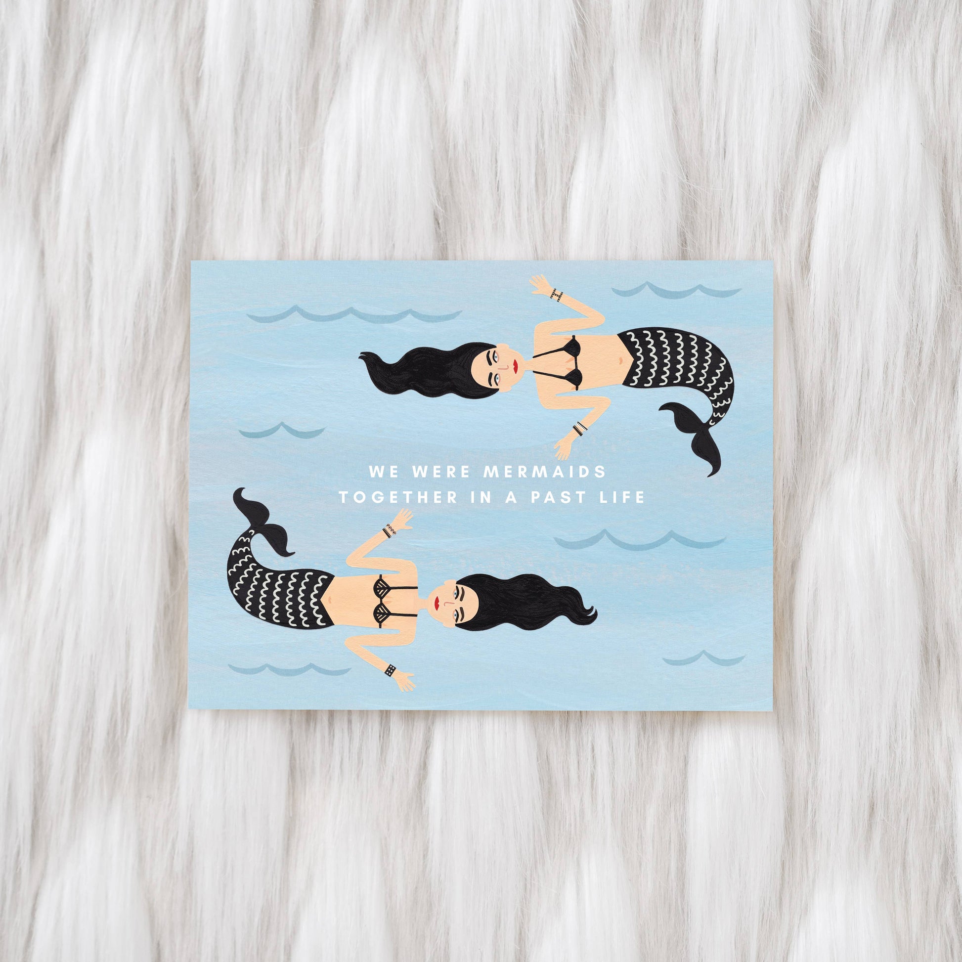 We Were Mermaids Together In A Past Life Together greeting card. For that special friend who you've twinned with for a million lifetimes. Single blank interior greeting card with matching ivory envelope.
