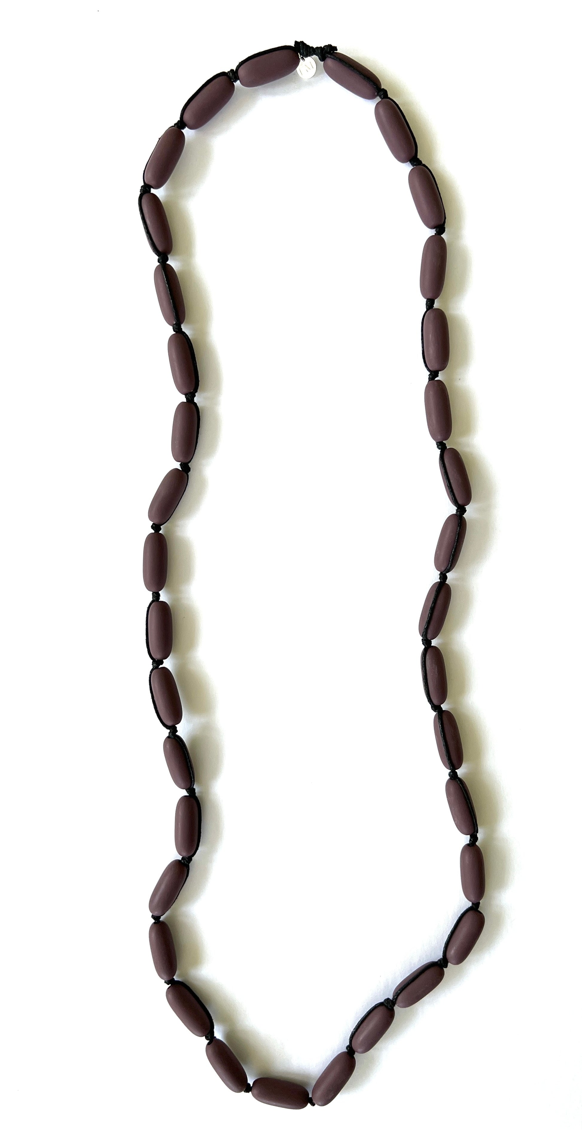 Each necklace is made of 35, 1-inch long resin beads that are hand-knotted on cotton cord, with a round, silver EM logo tag. The beads have a matte finish and are smooth to the touch. The necklace slips over the head, so there’s no clasp. It weighs 2.5 ounces and measures approximately 42 inches long (it hangs approximately to the navel). It can be worn doubled. Best layered in multiples—mix, match, mismatch. See Style Inspo for ideas.